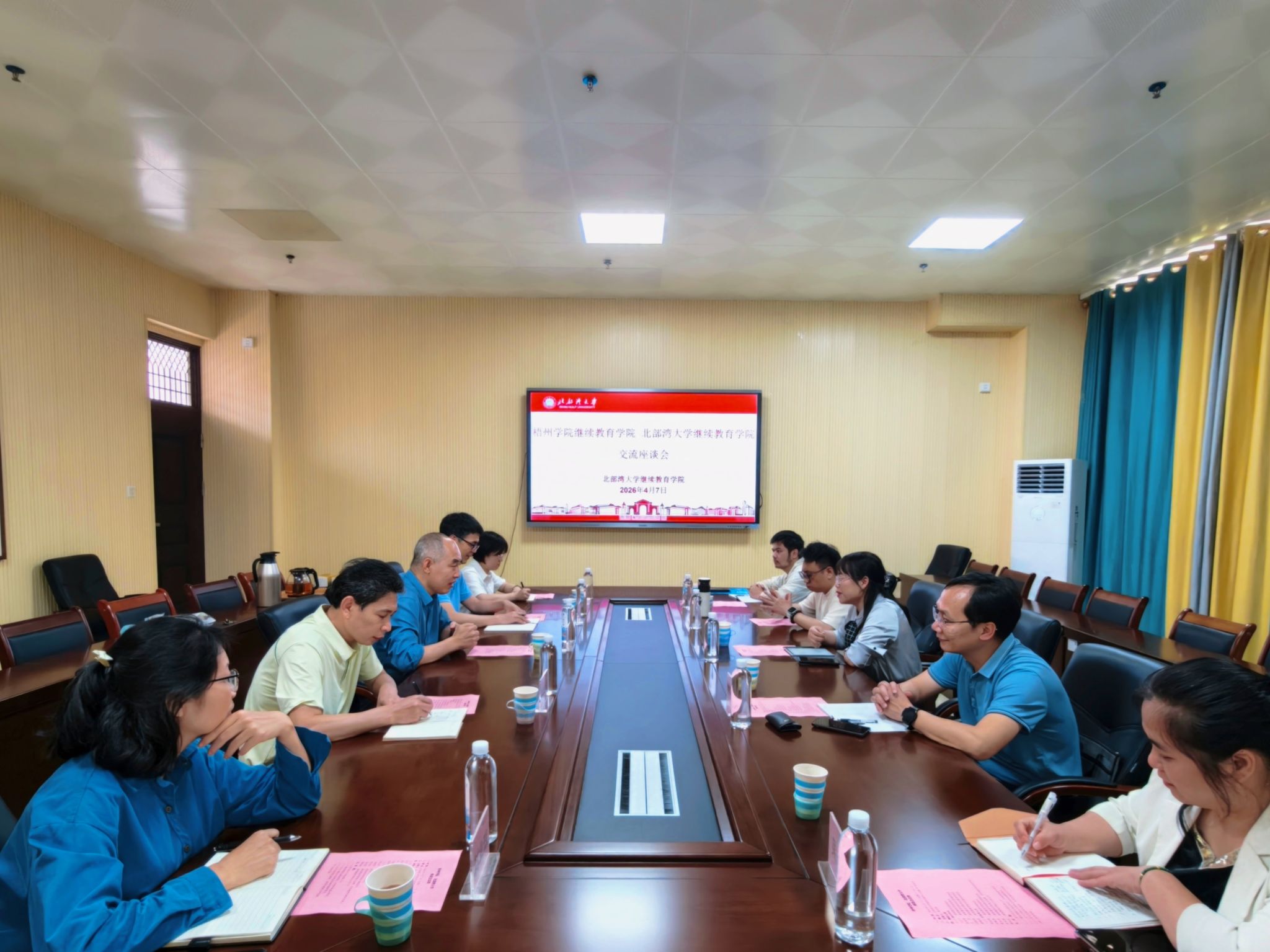 2026年4月7日下午,梧州学院继续教育学院院长文玉兰一行5人到北部湾大学继续教育学院调研交流。座谈会在学校国际交流中心大楼105会议室举行,由北部湾大学继续教育学院院长黄远林主持,副院长封彬贤及相关科室、项目负责人参加。