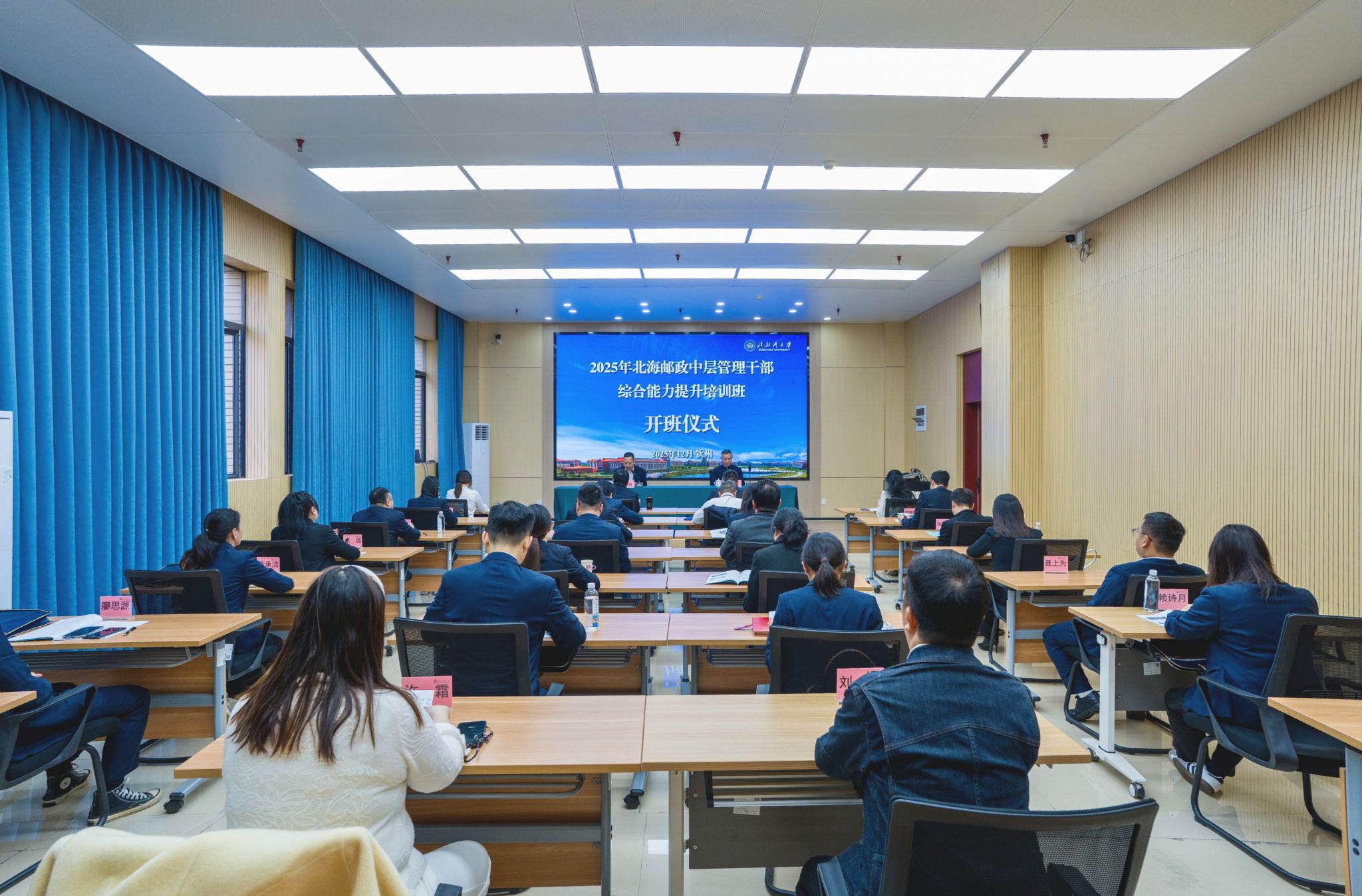 2025年12月19日,2025年北海邮政中层管理干部综合能力提升培训班在北部湾大学国际交流中心2号培训室顺利开班。本次培训为期2天,共有26人参加此次培训。
