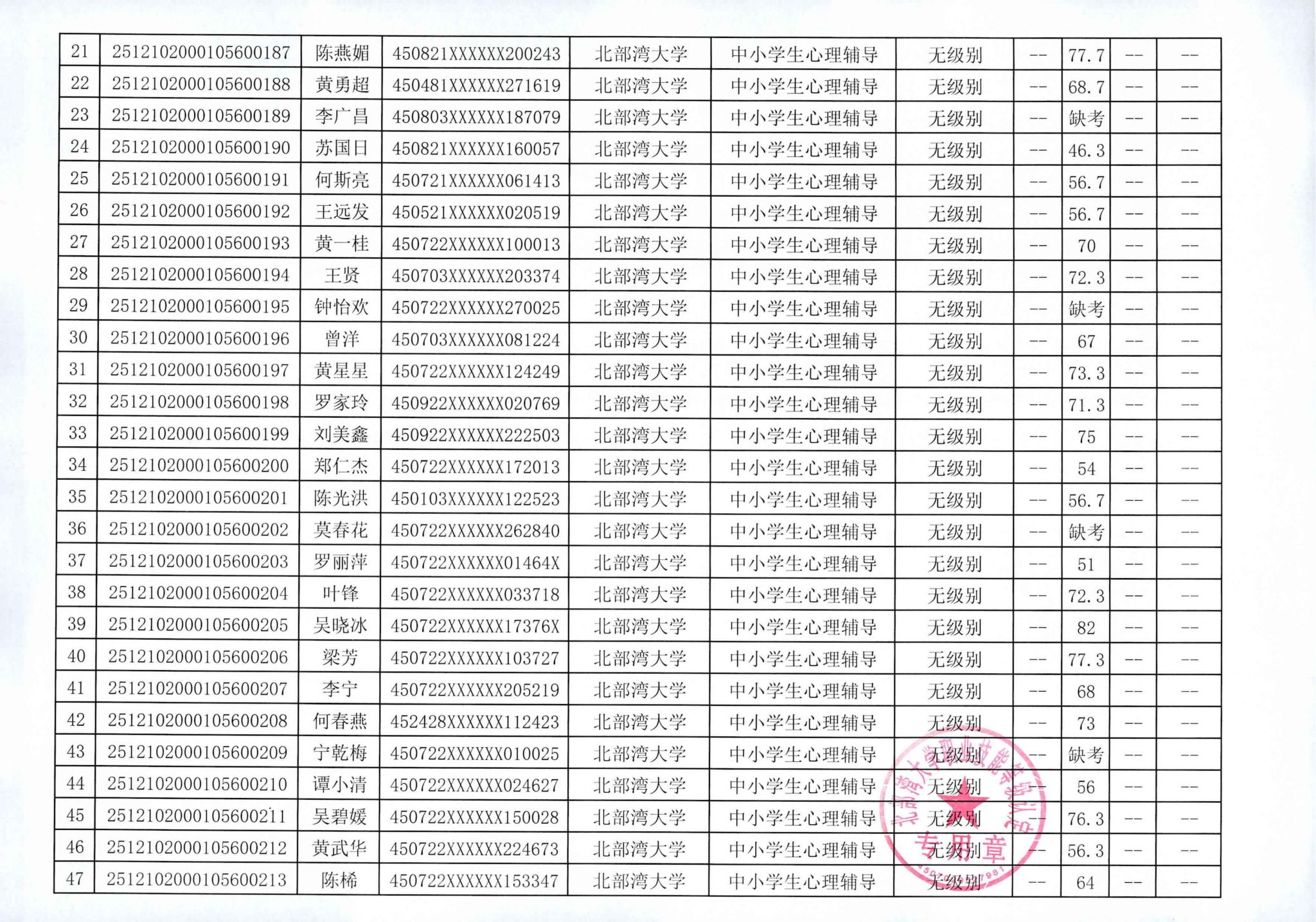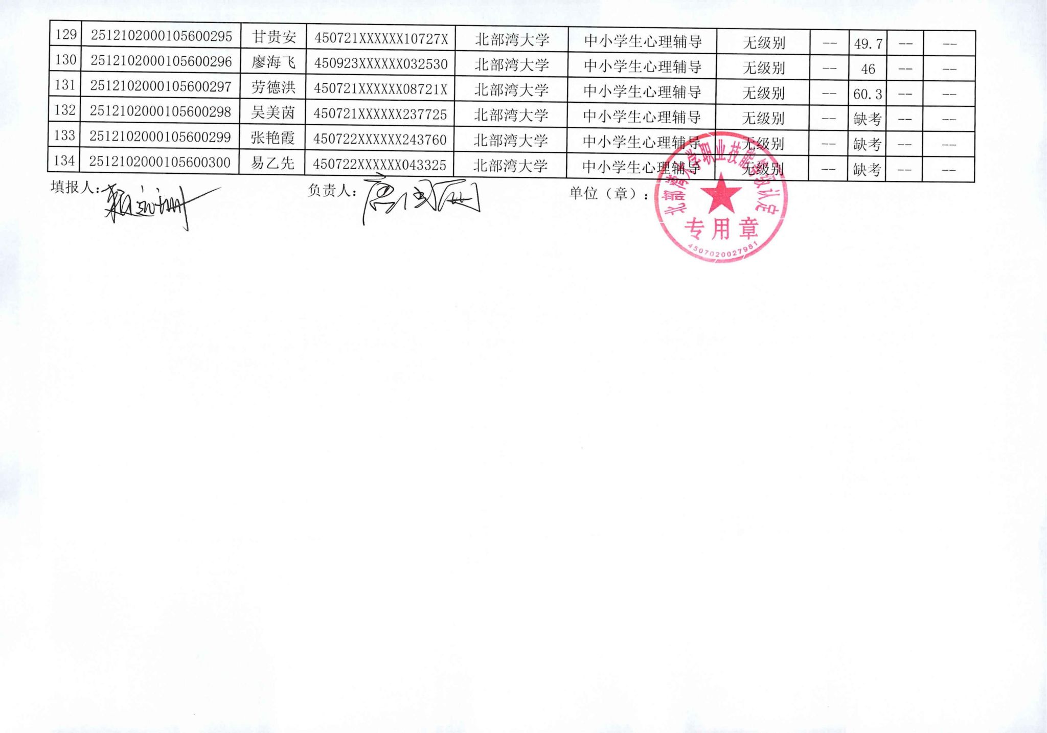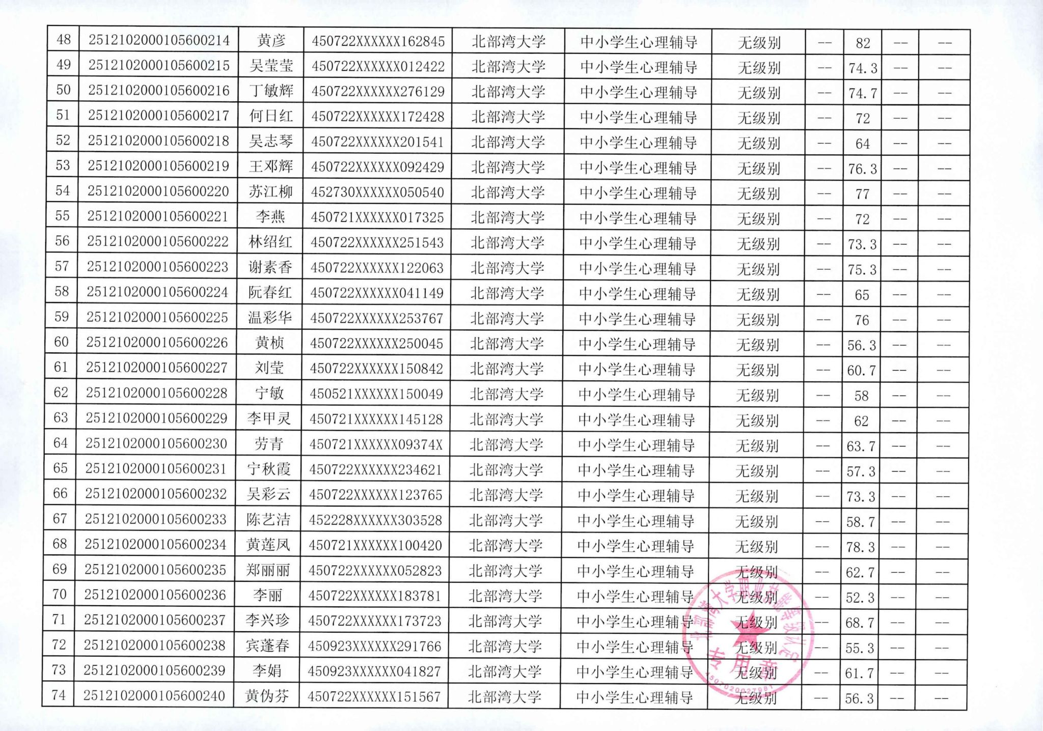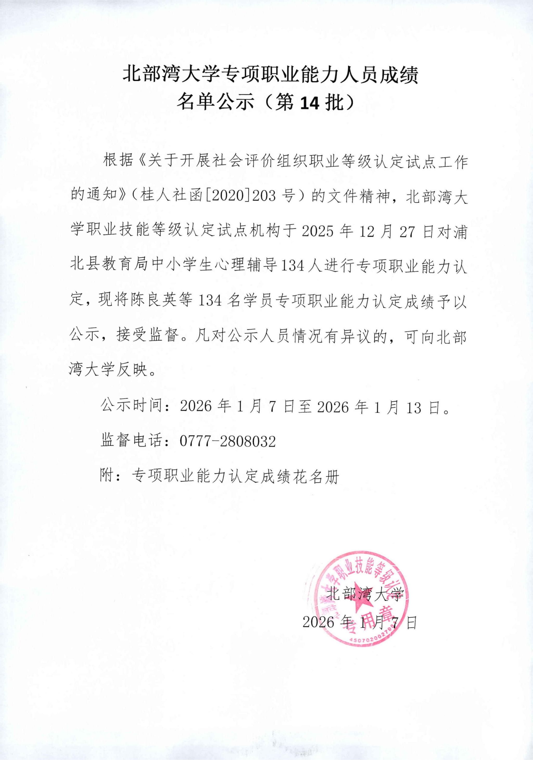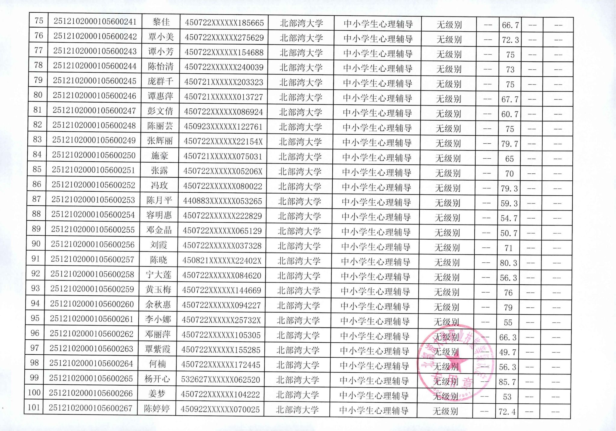北部湾大学2025年第14批专项职业能力人员成绩公示(中小学生心理辅导)