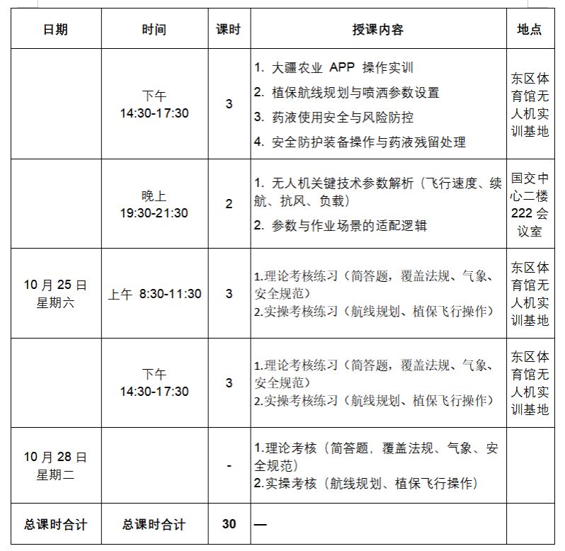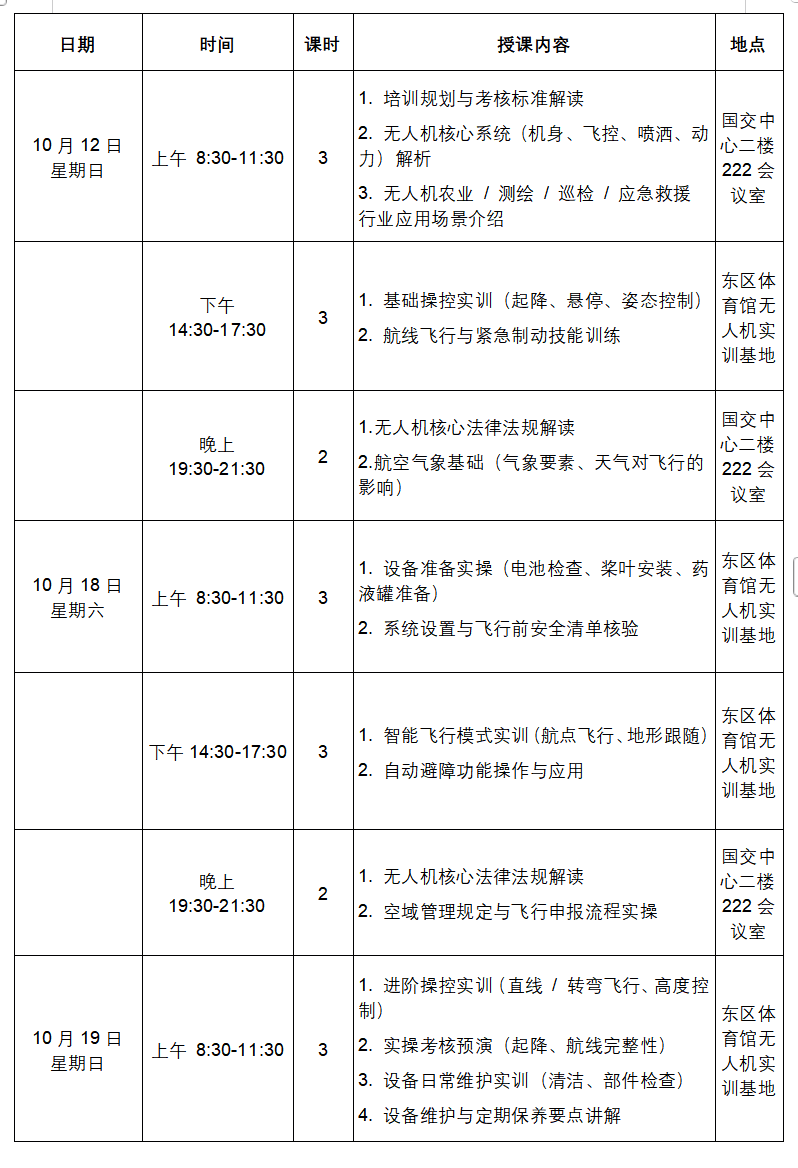 上课地点:国交中心二楼222会议室 、东区体育馆无人机实训基地