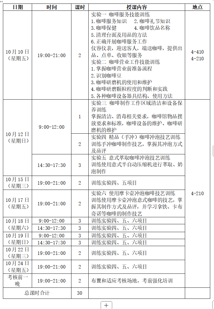 2025年下半年咖啡制作专项职业能力培训课程表